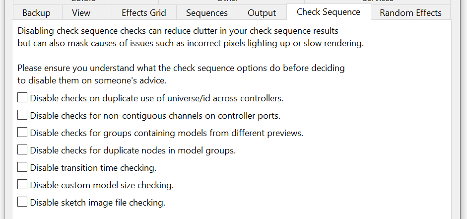 Enable/Disable warning or errors in the check sequence output.